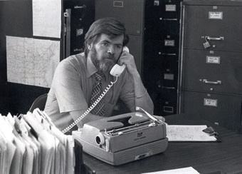 PHOTO: 1975: Vaughn was doing “Snow White” research on Interpol. He was at his desk on the seventh floor of the Manor, where the Guardian’s Office worked.
