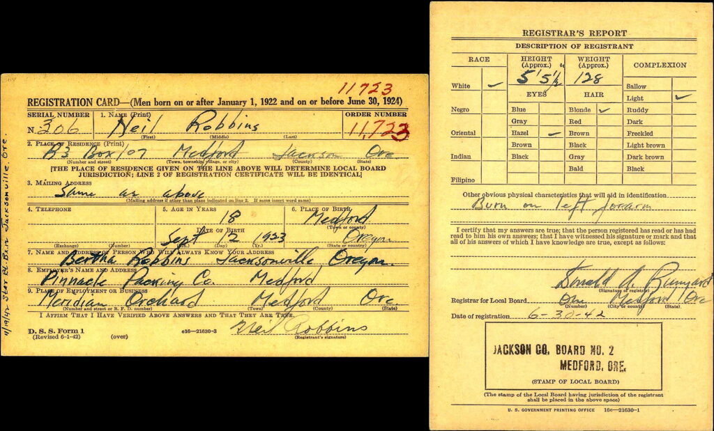 Neil Robbins, one of 11 children to John Emmett Robbins (1877~1951) and Bertha Belle Ernst Robbins (1890~1966), was born September 12, 1923, in Medford, Oregon because they didn’t have a hospital in nearby Jacksonville where his parents lived.