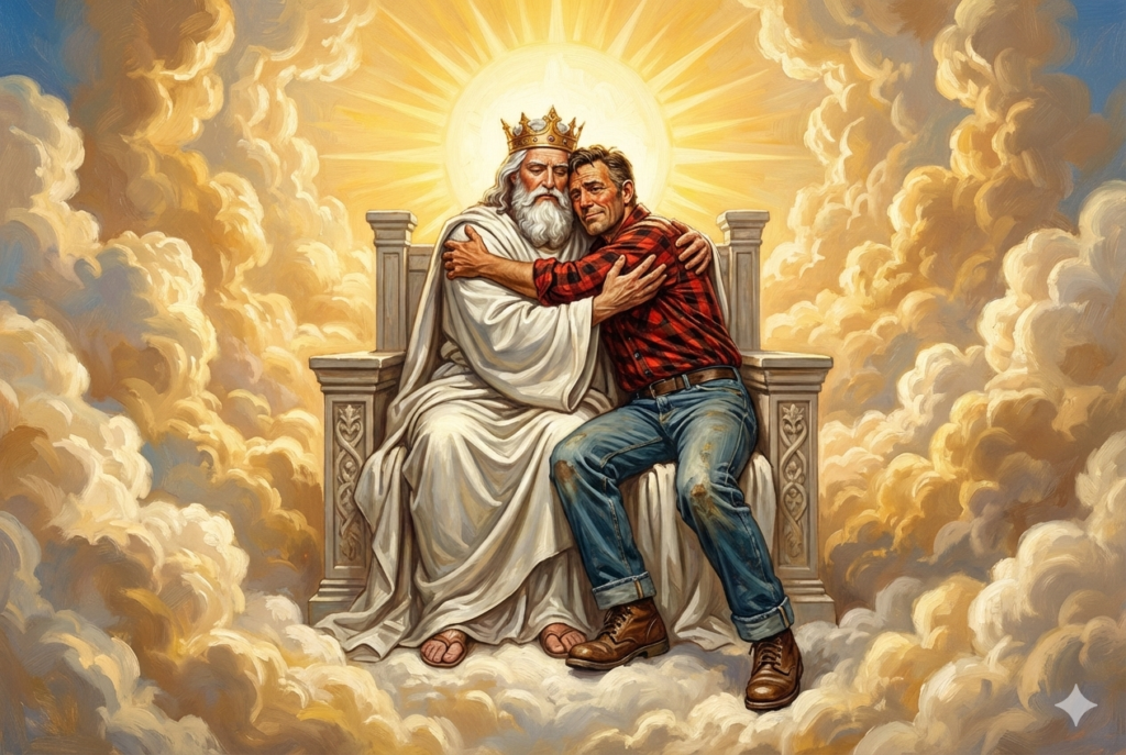 The image of Heavenly Father embracing His mortal son on the throne beautifully captures the LDS vision of exaltation: we’re literal spirit children of divine parents, sharing the same divine essence at different stages of progression—like a family reunion where Dad’s already fully glorified, and the guy’s still got dirt on his jeans from earth life, but the hug says, “Same kind, same potential, just keep growing.”