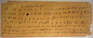 Sometimes called the ‘Caractors document,’ this slip of paper includes characters written by John Whitmer. The characters were purportedly copied from the Gold Plates, which were translated and published as the Book of Mormon. Photograph taken while the document was on display at the Church History Museum in Salt Lake City during the Sacred History: Treasures from the Restoration of the Gospel of Jesus Christ exhibition, held soon after the document was acquired by The Church of Jesus Christ of Latter-day Saints from the Community of Christ. There is no archaeological, linguistic, or other evidence of the use of Egyptian writing in the ancient Americas.