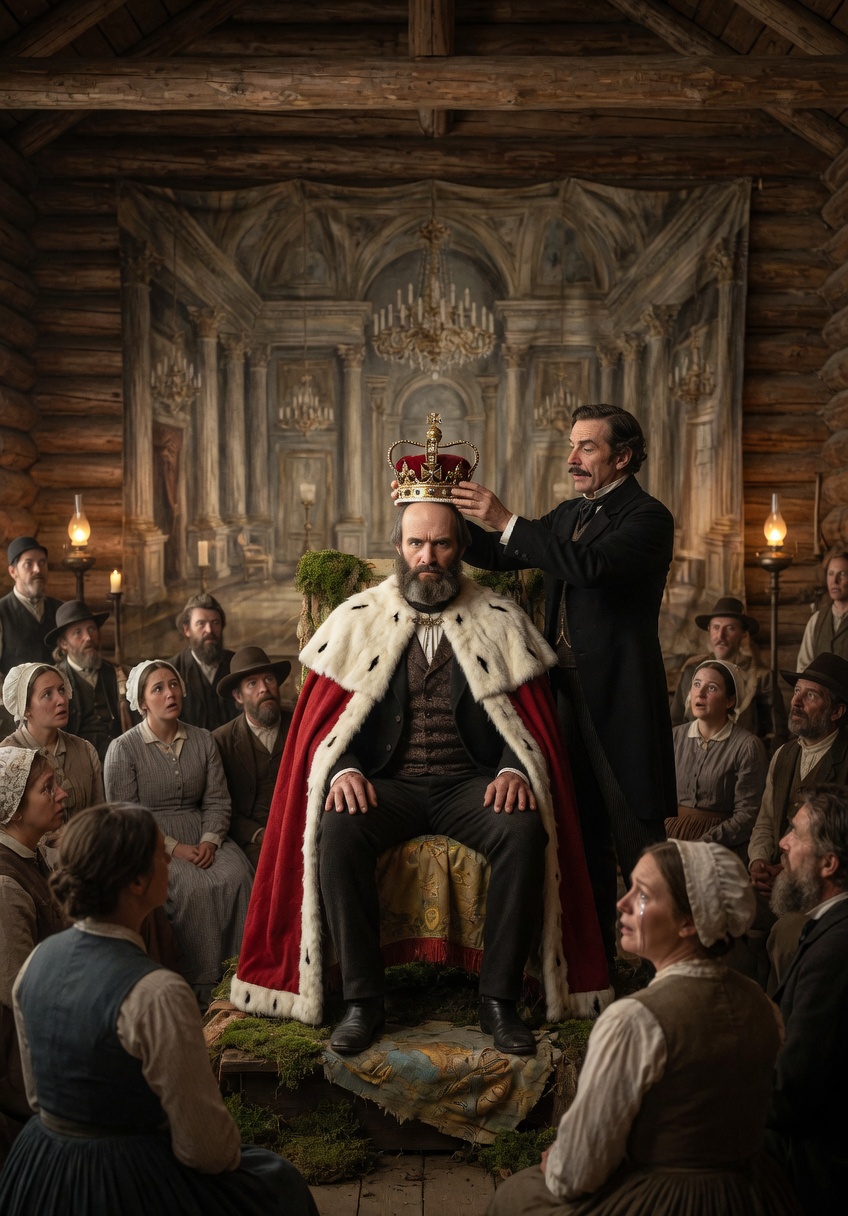 Strang entered wearing a red robe trimmed with white, made, by tradition, from a theatrical costume he had somehow acquired on the mainland. On his head he wore a crown of polished metal — tin, by some accounts, though the Strangites themselves insisted it was something finer. In his hand he carried a wooden scepter. The men surrounding him wore improvised regalia suggestive of a royal court: sashes, robes, the insignia of invented offices. The whole tableau had been assembled from frontier materials and frontier imaginations — homemade costumes, forest timber, the trappings of authority improvised out of whatever the island and its prophet could produce. It was, in every literal sense, theater. And yet it was also, unmistakably, a rite.