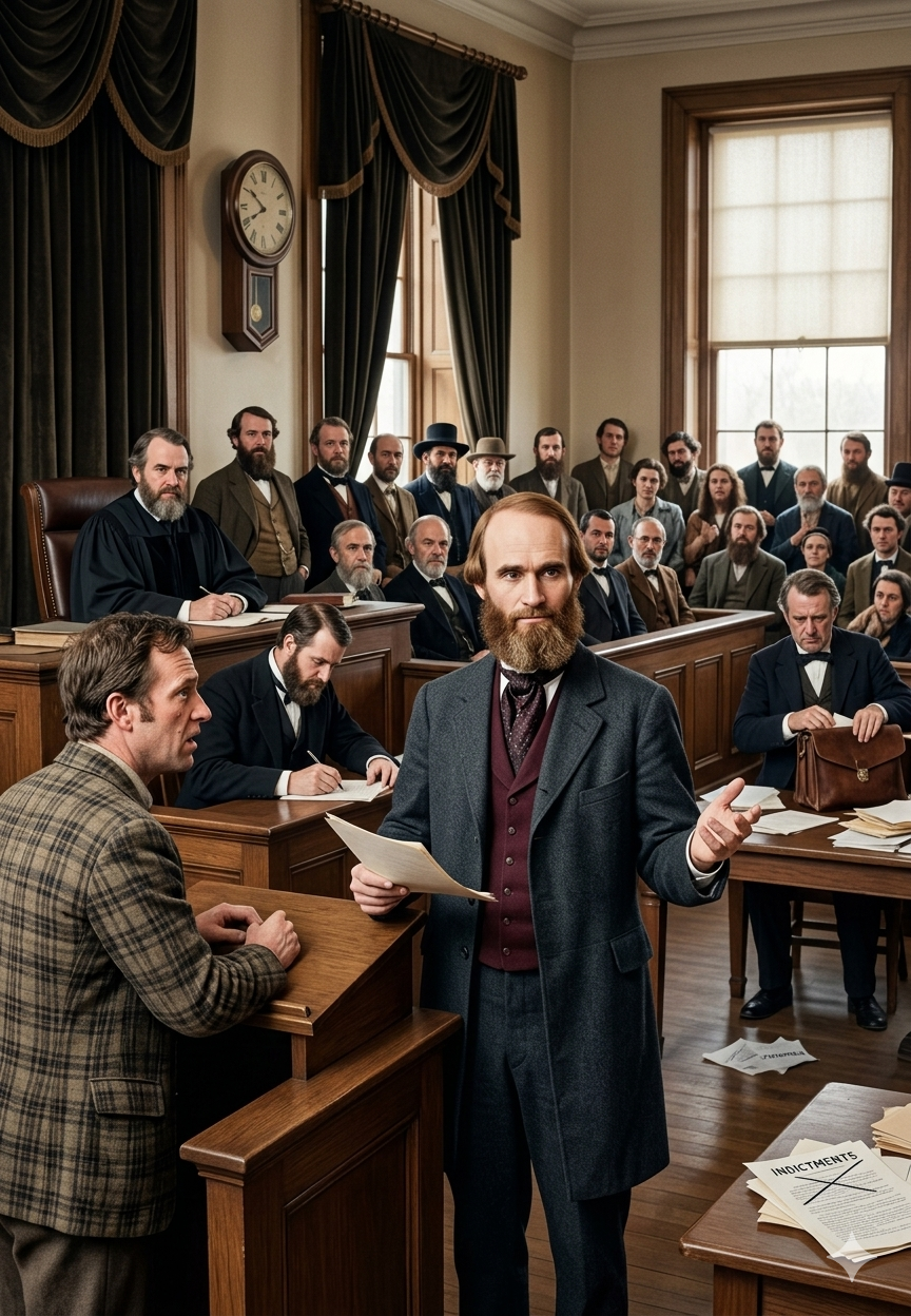 He conducted his own defense. A trained attorney before he was a prophet, he rose each day in the Detroit courtroom and cross-examined federal witnesses with the calm self-possession of a man who believed — because he had persuaded himself to believe, and because he had persuaded others to believe — that the proceedings against him were not a trial of his crimes but a persecution of his faith. When the verdict came in, the jury acquitted him on every count. The charges collapsed. The prosecutors went home. And Strang sailed back to Beaver Island not diminished but magnified, his kingdom vindicated, his enemies humiliated, his standing among the faithful raised by the simple and devastating fact that the United States of America had swung at him and missed.
