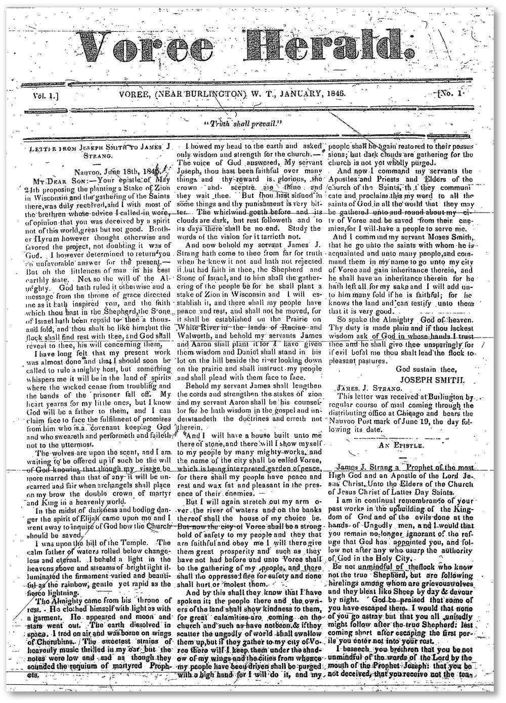 It shall come to pass in the latter days, that my people shall hear my voice, and the truth shall speak from the earth, and my people shall hear, and shall come and build the Temple of the Lord. My prophet, unto whom I send my word, shall lead them, and guide them in the ways of peace and salvation. In Voree the name of the Mighty One shall be heard, and the nations shall obey my law, and hear the words of my servant, whom I shall raise up unto them in the latter days.
