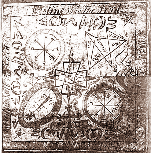 “The Smith Family owned three magic parchments that were carried in a bag meant to be worn by the owner. The parchments blend a mixture of Christianity and magical occult symbolism and were probably used as lamens; pendants meant to focus magical energies for a variety of purposes. The existence of these parchments suggest that the Smith family had more than a passing interest in magic. Many of the magic symbols are copied directly out of magical texts, including The Magus by Francis Barrett published in 1801, the New and Complete Illustration of Celestial Sciences by Ebenezer Sibly published in 1784, and The Discoverie of Witchcraft by Reginald Scot published in 1584.” — LostMormonism.com, “Smith Family Magic Parchments”