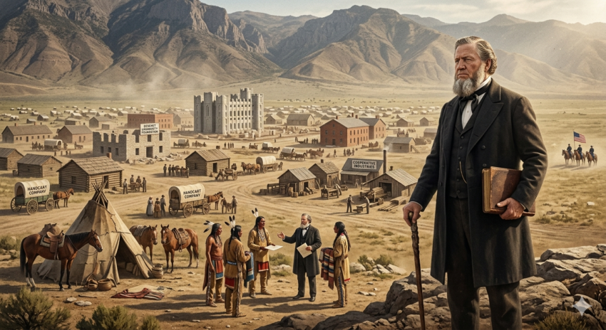 Image: An AI-generated image imagines an epic portrayal of pioneer city-buildings in the harsh American West. The composition contrasts the quiet, authoritative posture of the leader in the foreground with the intense labor of the settlers behind him. The settlement demonstrates a rapid transition from transient migration to permanent establishment. Temporary wagons share the landscape with foundational stone structures, early brick storefronts, and a massive, multi-story civic or religious edifice rising in the distance, illustrating the sheer organizational power required to tame the wind-scoured plains.