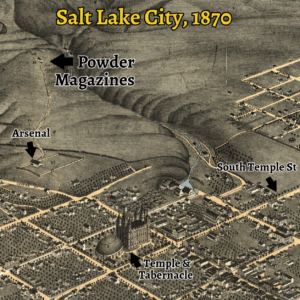 Then, on April 5, 1876, came the Arsenal Hill disaster. Two hunters fired into a powder magazine on the hill to the north. Five hundred tons of boulders, concrete, and pebbles rained over the city, killing the hunters and injuring dozens of residents. The blast blew out several of the Gardo’s windows. New glass had to be ordered from the East. By May 20, construction resumed.