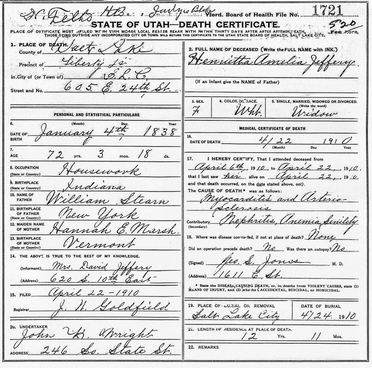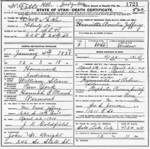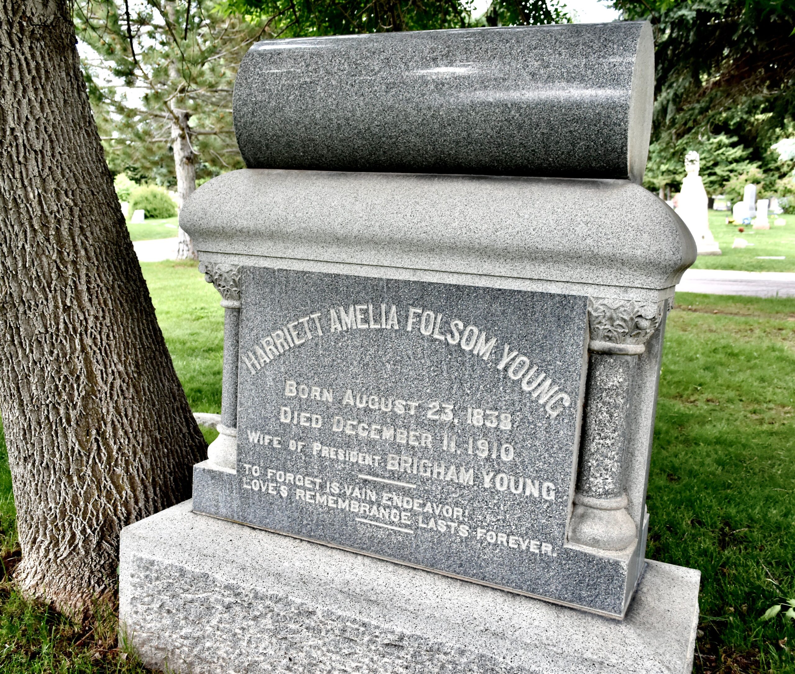 Harriet Amelia Folsom Young died at her home in Salt Lake City on December 11, 1910, at the age of seventy-two. Her death certificate listed the cause unexceptionally. She was buried in the Salt Lake City Cemetery, where her Find a Grave memorial (ID 1693) notes a simple stone in the old family section.