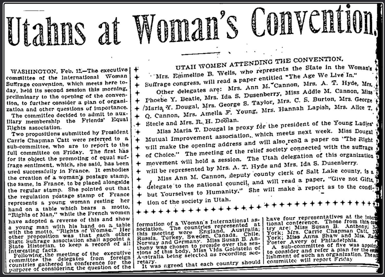 Perhaps most striking, in February–March 1902, when she was sixty-three years old, Amelia accompanied a Utah delegation to the Convention of the National Council of Women and the National American Woman Suffrage Association in Washington, D.C., where Senator Thomas Kearns personally presented her to President Theodore Roosevelt. The Buffalo-born schoolteacher who had crossed the plains in 1860 had, in her own lifetime, walked into the White House.